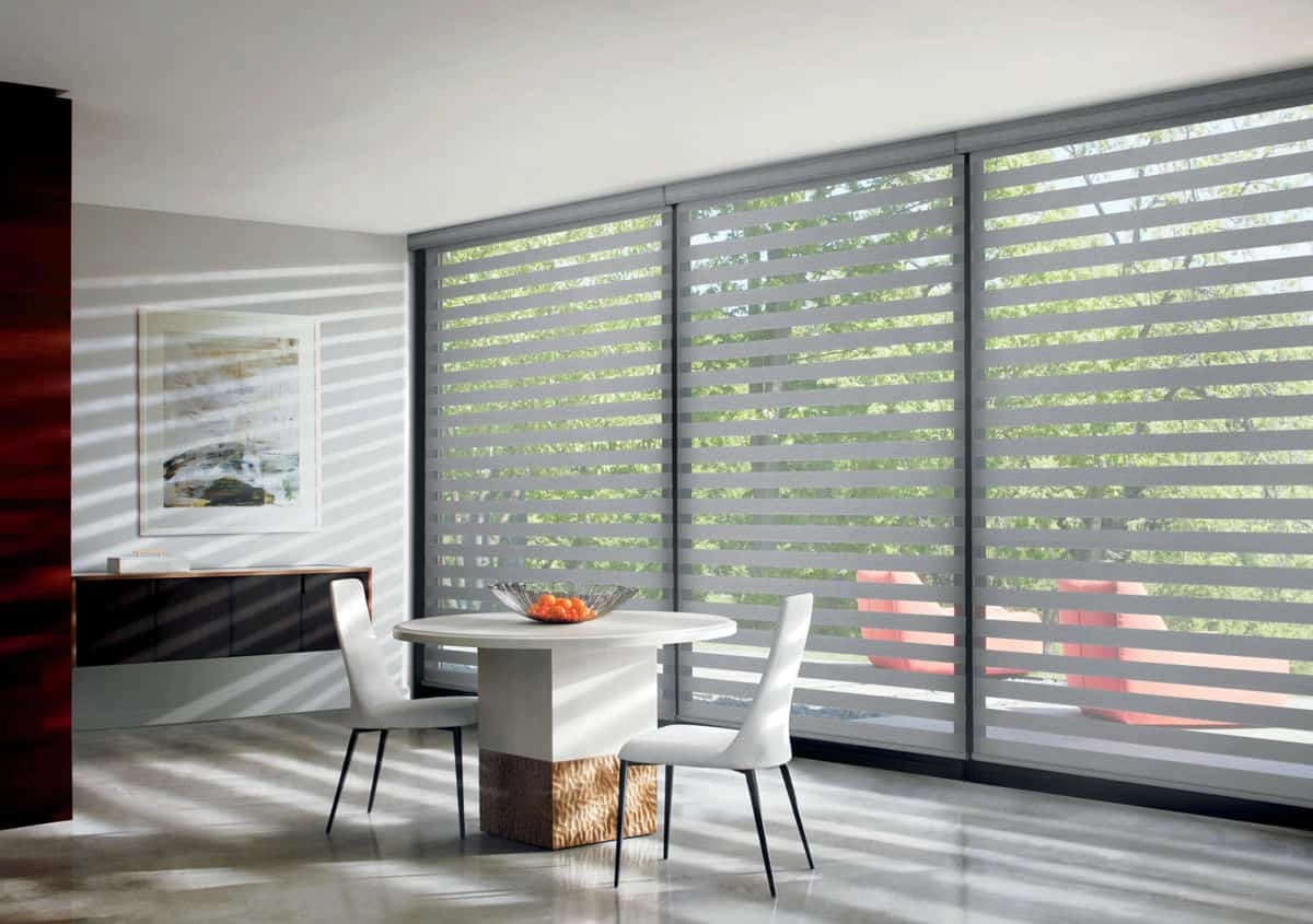If you are ready for a modern twist at your windows, look no further than our Hunter Douglas Designer Banded Shades. The special part about these striped zebra-style shades is the alternating sheer and solid fabric bands in one single shade. This design not only looks incredibly modern and artistic, but it also allows the shade to transition from open to closed seamlessly. It offers view-through capabilities, light control, and privacy all at once. At the same time on-trend and timeless, it is a modern take on a roller shade and sheer shade all in one. It is pure magic!